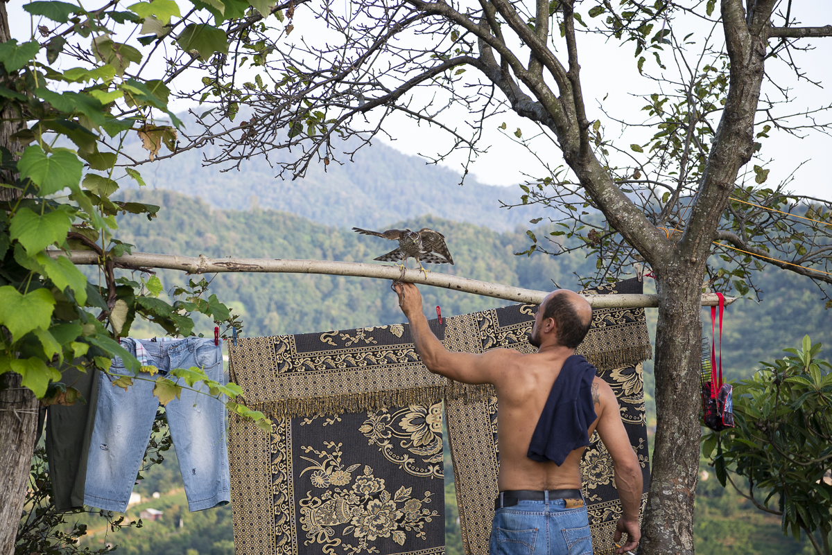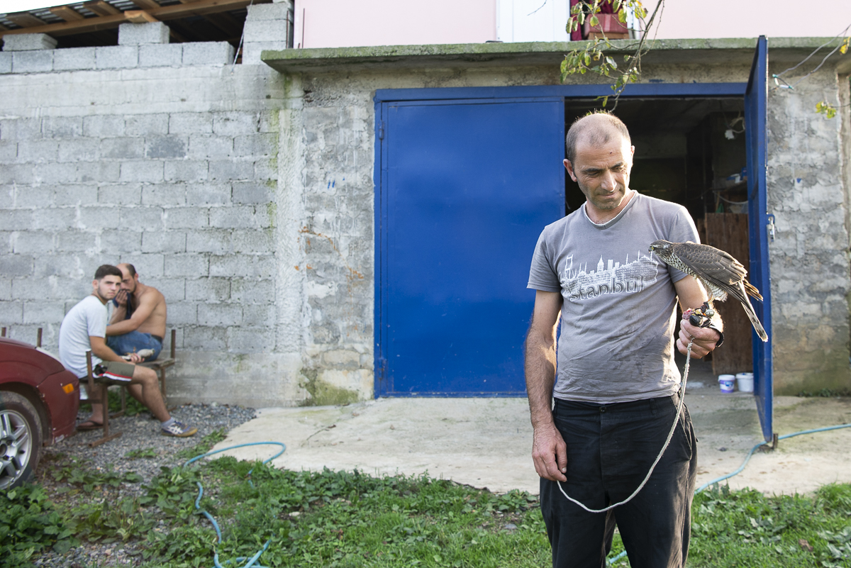 Gela, the village falconer, trains one of his captured birds. Falconry has long been a celebrated tradition, entrenched in Georgian culture. Only those with a licence can legally practise falconry, yet there are many who do not hold a licence. Trapping without a licence and hunting has long been illegal, however it has proved difficult to monitor. Research has shown that on average 13,000 raptors are killed every year.